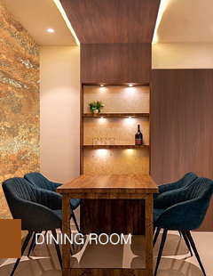 - Dining Room: Stone Design Laminates on dining tables present durability and charm. Abstract Laminates on crockery units provide a lively touch.