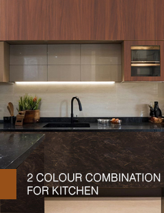 - Colour Combination for Kitchen: A two-tone kitchen interior design, such as white and oak, offers a classic appearance, while pastel blue with grey Crystal Laminates provides a refreshing touch for kitchen interior design.